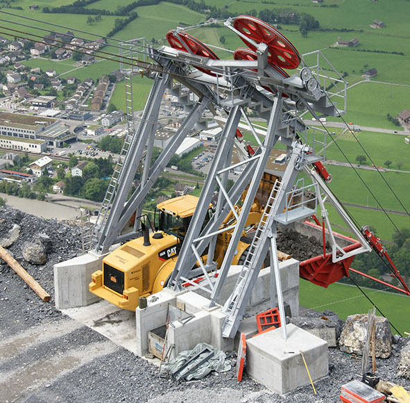 Materialseilbahn Mollis – Beim Steinbruch in Mollis wurde bis vor kurzer Zeit das Abbruchmaterial über die hohe Felswand zur Produktionsstelle fallen gelassen. Die damit verbundene Staubentwickelung schränkte den Betrieb beträchtlich ein. Mit der von uns projektierten und ausgeschriebenen Pendelbahn mit einer Förderleistung von 90 Tonnen pro Stunde konnte die Leistungsfähigkeit des Kieswerks stark gesteigert werden. Dank der neuen Materialseilbahn mit einer Nutzlast von 18 Tonnen können nun auch grosse Felsblöcke für den Flussbau gewonnen werden.